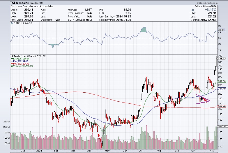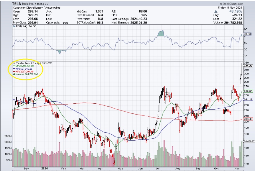 - Media móvil de 20 días (verde): Esta media muestra las tendencias a corto plazo, lo cual es útil para identificar cambios rápidos en la dirección del precio. Cuando el precio está por encima de esta media, se considera una señal de fortaleza a corto plazo, ya que los compradores están dominando el mercado en ese período. Si el precio cae por debajo de la media, indica debilidad en el corto plazo. Inversionistas a corto plazo suelen usar esta media para encontrar puntos de entrada o salida rápidos. Por ejemplo, si el precio cruza hacia arriba la media móvil de 20 días, puede ser una señal de compra; si cae por debajo, indica una señal de venta. Actualmente, Tesla presenta una tendencia alcista a corto plazo, ya que el precio de la acción está bien por encima de la línea de 20 días.