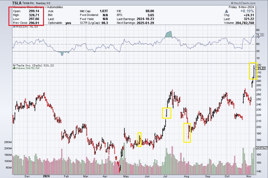 Finalmente, en el recuadro rojo, puedes ver el precio de apertura, así como los precios máximos y mínimos del día para Tesla. Estos son los datos clave que necesitas para poner en práctica esta estrategia de trading diario. Y hacer que la magia suceda.