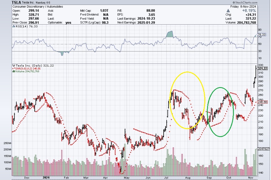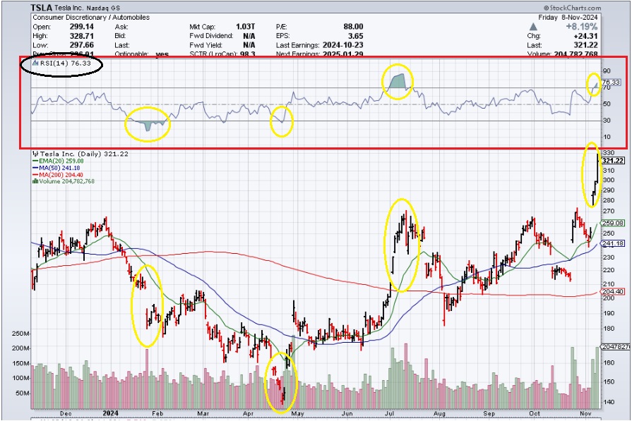 Toda esta información es claramente visible en las gráficas y muestra la utilidad del RSI, que ayuda a identificar momentos propicios para comprar o vender de manera sencilla. Actualmente, Tesla tiene un RSI de 76.33 (marcado en el círculo negro), lo que indica que está sobrecomprada. Esto sugiere que es un buen momento para vender antes de que el precio comience a caer.