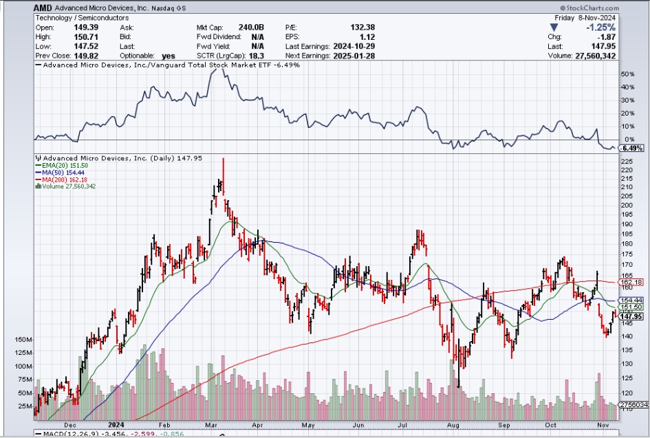 En el caso de Tesla, esta perforó su media móvil de 200 días a principios de 2024, como pueden ver en la gráfica. En la parte inferior sobre el eje de las X vienen los datos seccionados de meses y años, y podrán observar que durante seis meses el precio estuvo muy bajo, y esto fue porque las perspectivas financieras de tesla no estaban mejorando, todo lo contrario, las ganancias se estaban contrayendo, sus ventas de autos estaban cayendo, la creciente competencia de autos eléctricos, especialmente los de origen chino es dura ya que ofrecen precios competitivos con especificaciones similares. Ahora, el contexto para Tesla ha mejorado, y más inversionistas han comenzado a comprar y retener sus acciones, elevando el precio nuevamente por encima de la media móvil de 200 días. Sin embargo, su comportamiento inestable refleja una acción que, bajo el indicador de la media móvil de 200 días, se considera “neutral,” es decir, ni claramente positiva ni negativa. Aquí, el análisis se vuelve subjetivo, y dependerá de cada inversionista si desea ver el vaso medio lleno o medio vacío para decidir si Tesla es una buena compra o no.