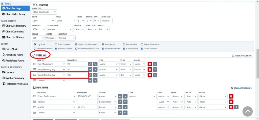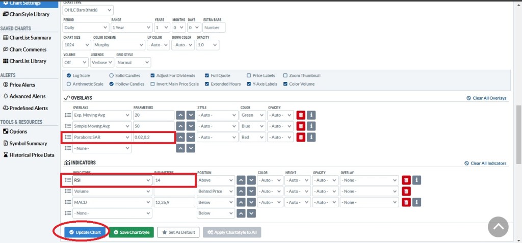 3.- Configura el SAR Parabólico: Desplázate hacia abajo hasta el menú de configuración. En la sección «Overlays», puedes agregar o modificar indicadores. Como solo hay tres espacios para mostrar indicadores de este tipo, reemplazaremos la media móvil de 200 días por el SAR Parabólico. Haz clic en el nombre de la media móvil que deseas quitar, se desplegara el menú, selecciona «Parabolic SAR» y haz clic sobre el para confirmar el cambio. A continuación verán el nombre del Sar parabólico en el espacio donde estaba el de la Media móvil.