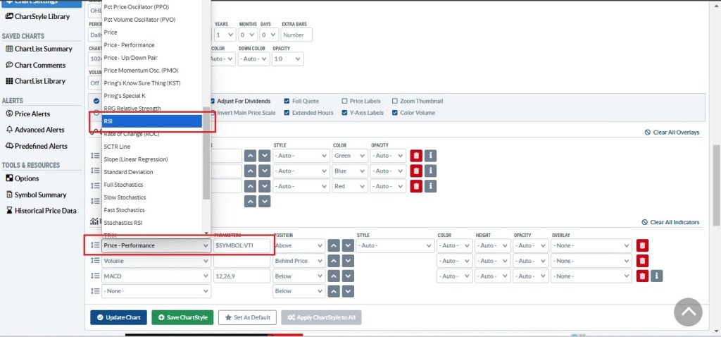 4.- Agrega el RSI de 14 días: Ve a la sección «Indicators». Ahí nos posicionaremos sobre Price-Perfomance, para realizar el mismo movimiento que en el paso anterior, le damos clic, se desplegara el menú y buscamos RSI, le damos clic, ahora aparecerá en el cuadro el nombre de RSI en vez de Price-Performance.