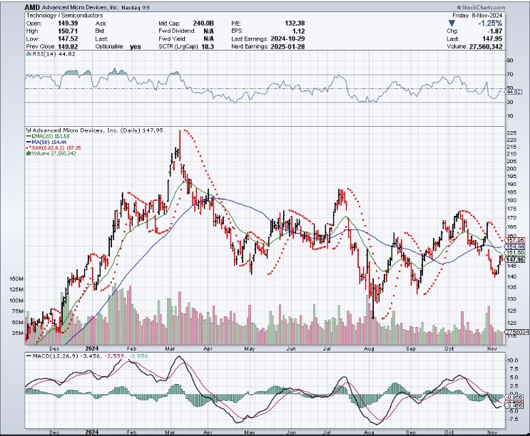 2.- Visualiza la gráfica: Tras presionar Enter, aparecerá el gráfico de la empresa seleccionada, (ademas de anuncios publicitarios, de algun lugar tiene que salir el dinero para manener la pagina), en este ejemplo usaremos AMD. El gráfico ya mostrará algunos indicadores básicos, como las medias móviles de 20, 50 y 200 días, el volumen de negociación y el rango de precios diario. Además, el gráfico estará configurado en velas.